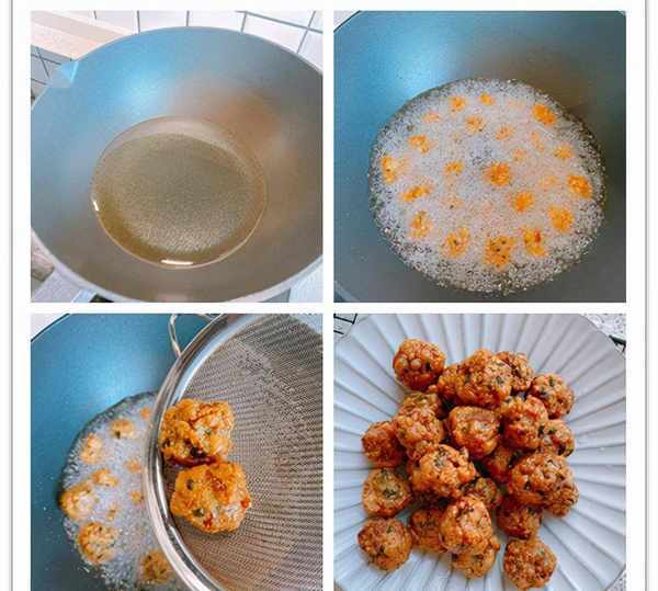 3、鍋燒熱,加入稍微多一點的食用油,油溫7成熱,下入丸子,大火炸,丸子是已經油炸過的,這次是復炸,復炸油溫要高一點,這樣才能炸好的丸子才能外酥裡嫩,高油溫大約炸45S,炸到表面顏色金黃,出鍋;