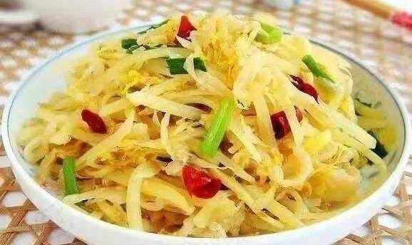 3.等到油溫差不多五成熱的時候把土豆絲倒入,炸到金黃黃的樣子的時候就可以撈出來瞭,白菜可以在快收尾的時候加入過一下。