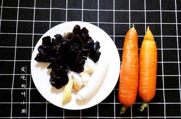食材:胡蘿卜兩個,泡好的黑木耳適量,大蔥一根,蒜瓣適量,生薑一塊。
