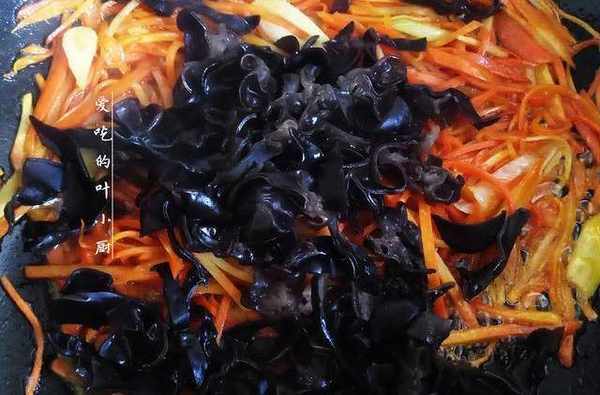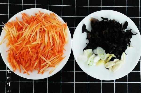 1.食材準備:把胡蘿卜洗凈後去皮,然後切成細絲;泡好的黑木耳洗凈後,同樣切成細絲;大蔥切蔥花,蒜瓣切片,生薑切絲。