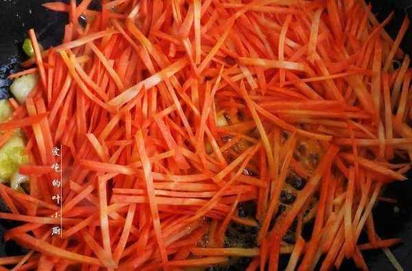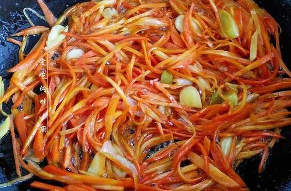 3.鍋中炒出香味後,先把切好的胡蘿卜絲放入鍋中翻炒,把胡蘿卜絲炒軟炒變色。