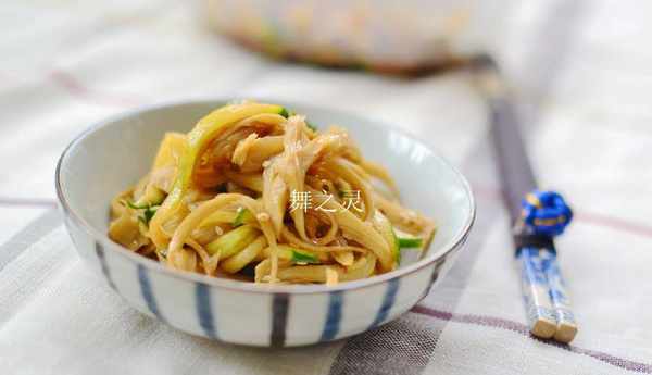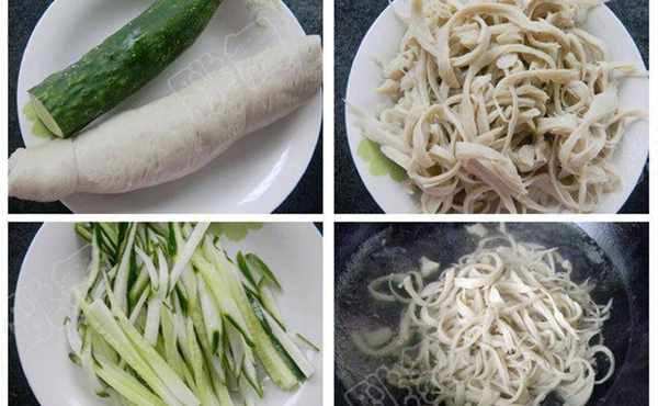 黃瓜切絲,面筋用手撕成細條,然後放入開水中煮開撈起