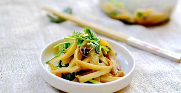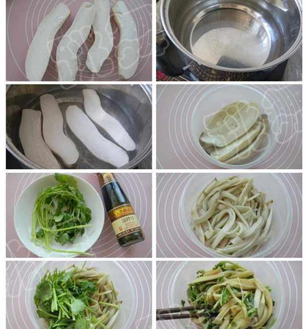 杏鮑菇切開放入水中煮開,稍微涼後撕成細條,另外準備少許的香菜蒜蓉,根據自己口味放鹽,雞精,香油什麼的拌拌就可以