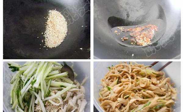 小火炒香芝麻,然後另起鍋放油加幹辣椒和花椒爆出香味,將材料混合後加入生抽、陳醋、雞精糖拌一拌就好