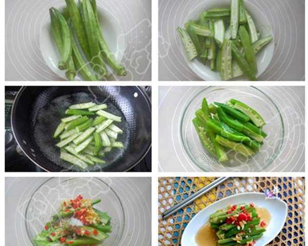 將秋葵對半切開,燒開水滴油放入秋葵,燙下變色就可以撈起來