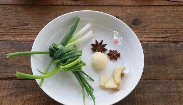 3.小蔥兩棵摘洗幹凈,打個結捆好,薑蒜塊去皮拍扁,另外再準備上做五花肉必備的八角,喜歡的還可以準備香葉、草果等,五香料的多少隨個人喜歡增減。