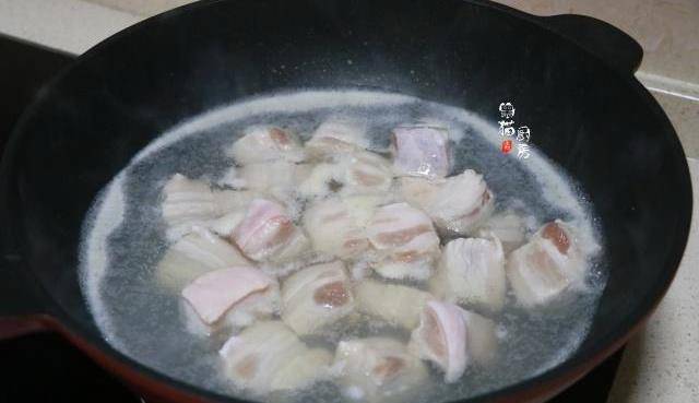 4.帶皮五花肉切成大小方塊後,放入冷水鍋中,鍋中要放2片薑片和1勺料酒一同煮開,去去肉腥味和血水雜質。煮2、3分鐘左右,把肉塊撈出放入涼水中沖洗一下。