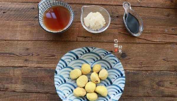 2.準備去瞭皮的板栗,板栗的去皮小竅門我之前發過一篇文章,感興趣的朋友可以去翻看一下相關內容。花雕酒小半碗,黃冰糖約50克,生抽2茶匙,調味料先準備好。