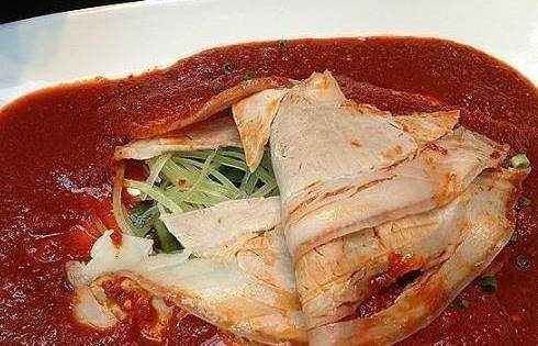 白肉;將後臀肉放入鍋中加清水煮至斷生,關火浸泡40分鐘,撈出切成能透光的薄片。將肉片放入漏勺,用勺子盛起燒開的湯汁澆在肉上,待肉片變得卷曲,盛入盤中。蒜泥放入碗中,加鹽、味精,沖入熱高湯調勻,加入剩餘調料拌勻,澆在肉片上即可走菜。