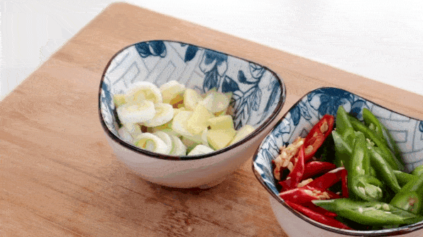 (3)再來準備輔料,蔥段、大蒜、薑片、青紅椒切段備用。