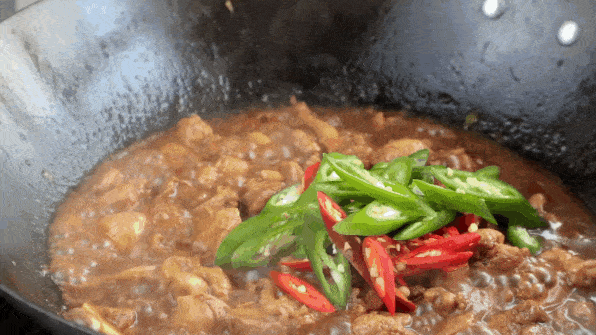 (7)加水沒過雞肉,小火慢燉30分鐘至雞肉軟爛,雞肉軟爛後如果鍋內的湯汁還比較多,開大火收一下湯汁至原來湯量的三分之一即可。倒入青紅辣椒段和吐沙完畢的蛤蜊,翻炒均勻後蓋上鍋蓋,小火燜煮片刻。