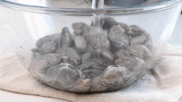 (4)新鮮的蛤蜊放入大碗中,加入適量溫水浸泡20分鐘左右,水的溫度在40-50℃,不燙手為宜,太熱的水蛤蜊是吐不出來沙子的。