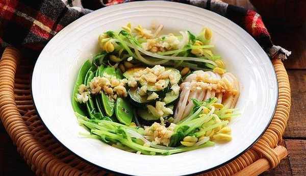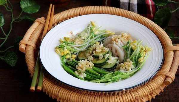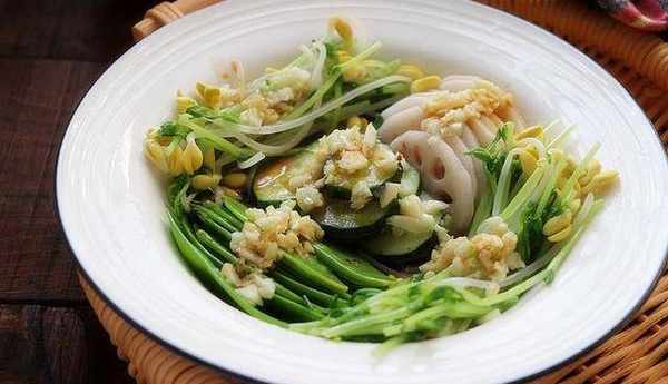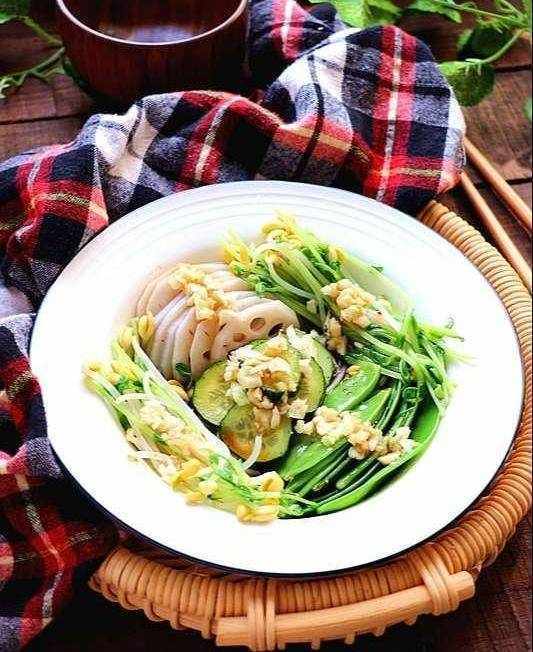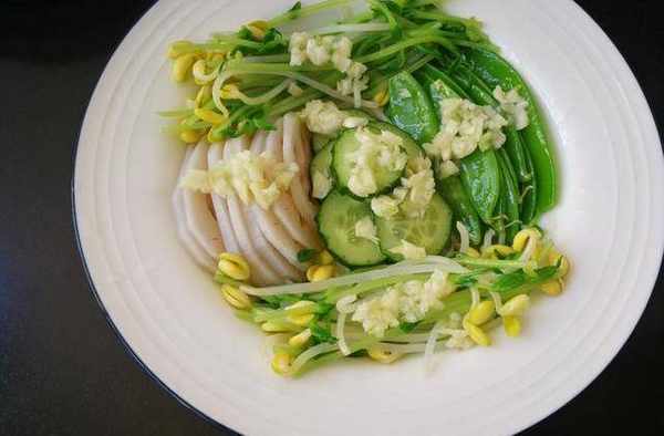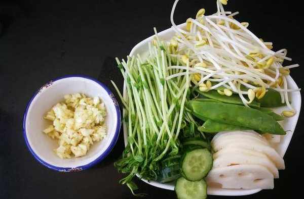 主材料:蓮藕50克,荷蘭豆30克,豆苗30克,黃豆芽30克,蒜10克,葵花籽油2勺
