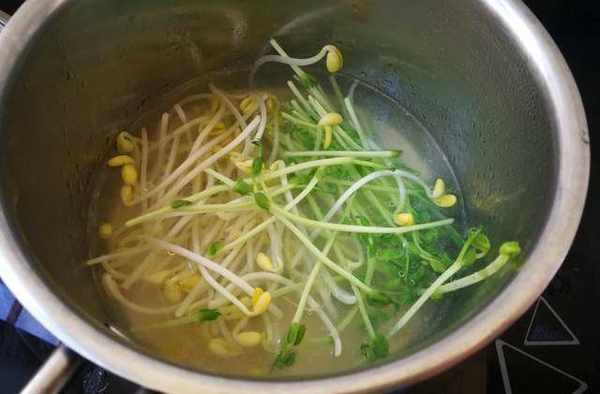 接著再把黃豆芽、豆苗也放鍋內,稍灼一下即可撈出