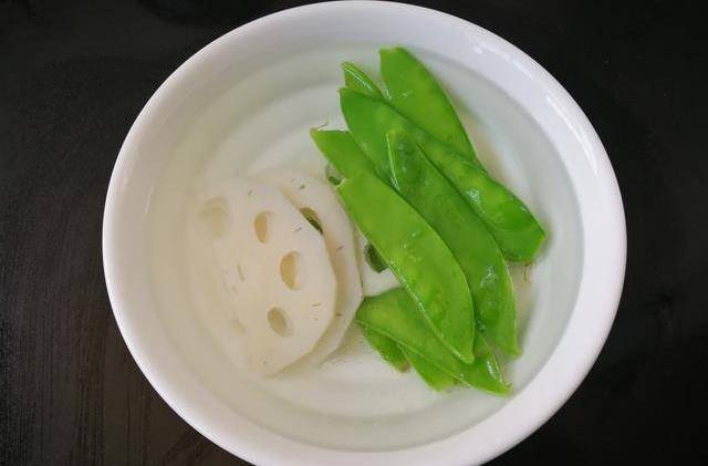 蓮藕片與荷蘭豆撈出後,放冷開水裡過涼,再濾出水分待用