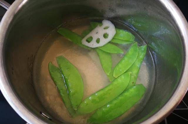 煮沸適量清水,倒進一點點的葵花籽油,把蓮藕片灼3分鐘後再放荷蘭豆,待荷蘭豆轉油綠後,把兩食材都撈出