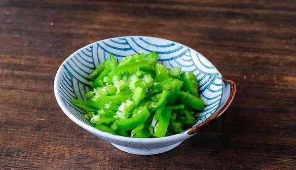 準備清洗幹凈的尖椒,香菜和大蔥各切成絲,然後放在盆中,然後切點老咸菜疙瘩絲,用水多沖洗幾遍,洗掉多餘的鹽分,然後攥幹水分和,尖椒大蔥香菜放一塊,