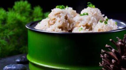 5.每個丸子周身滾上一層生糯米(在瀝幹水分的糯米中滾動,直到肉丸上粘滿瞭糯米,看不見肉餡為止)