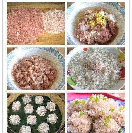 豬肉300g,糯米150g,料酒適量,鹽適量,薑適量,香油適量,白糖適量,雞蛋1個,雞精適量,蔥適量。