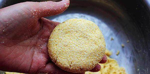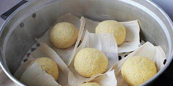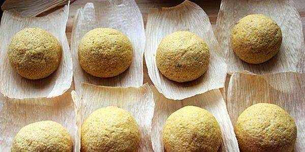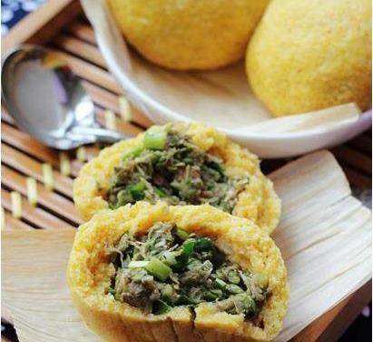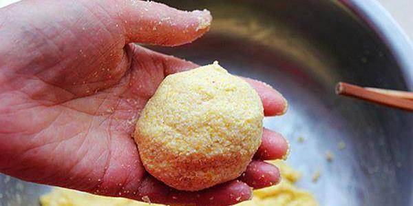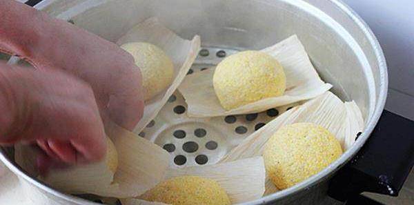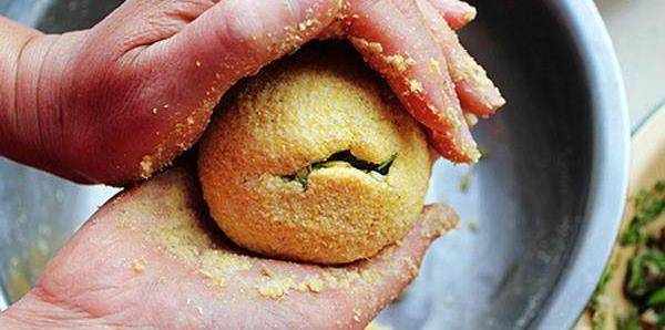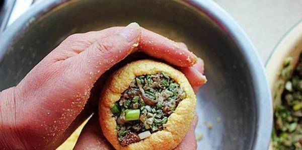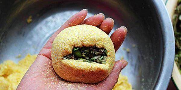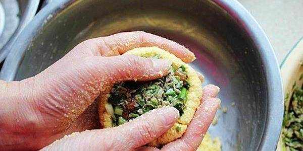 5、醒好的玉米面團用手揣勻,揪下一團,壓成餅狀,放上一大團餡,雙手合攏,邊團邊轉直到面團將餡料完全包住,收口,收口向下放入苞米皮;