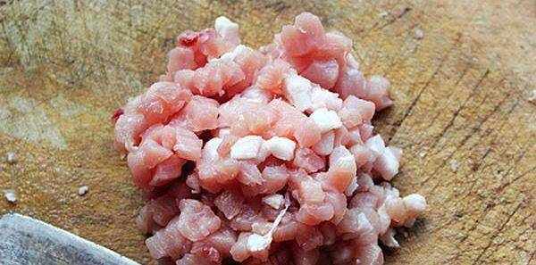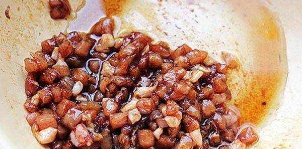 3、豬肉切成小丁,加入3大勺的花生油、適量的面醬攪拌均勻,醃制10分鐘;