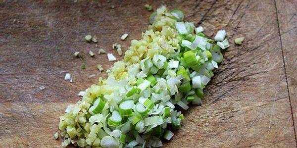4、槐花剁碎,韭菜切碎,蔥薑剁碎,放在醃好的肉丁上,加少許五香粉、鹽、生抽、香油、蛋清,向一個方向攪拌上勁兒。