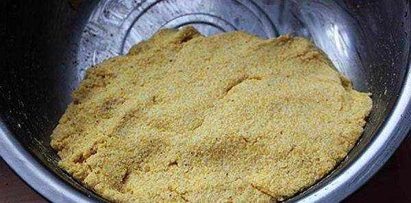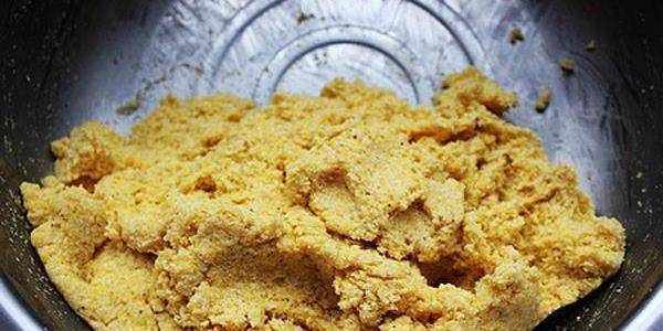 2、玉米面裡摻入適量的面粉,加入一大勺的豆粉、少許糖,加入4克酵母粉,攪拌均勻後加入溫水,調成濕潤的棒子面團,一旁醒制30分鐘。