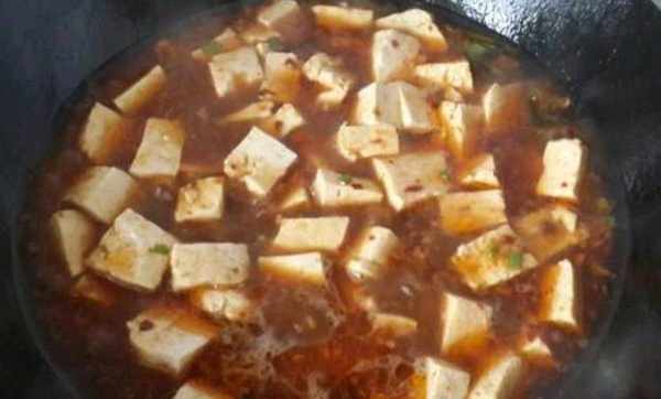 3.醬炒至八成熟時加水,開始放入切好的豆腐塊