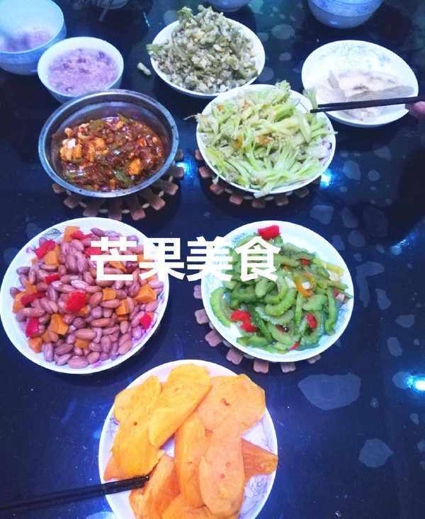 圖片中的食物依次為:蒸紅薯、鹵制紅薯花生米、辣椒炒苦瓜、傢常炒醬、素炒西藍花、粉蒸豆角