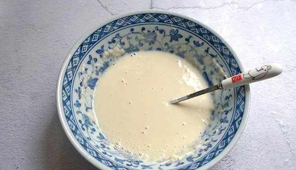 2。在面粉中加入適量的水做糊狀物。不應一次添加水以防止過度稀釋。一定要把漿糊掛起來。
