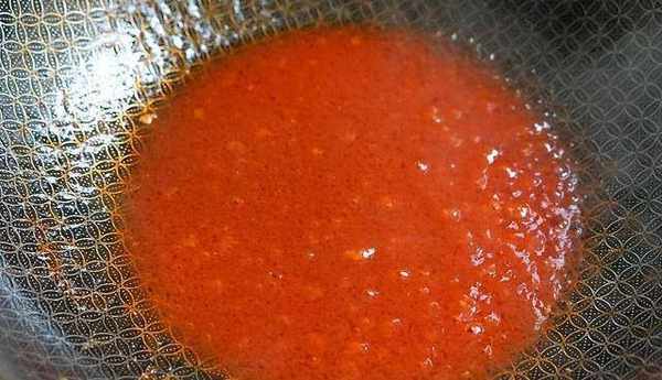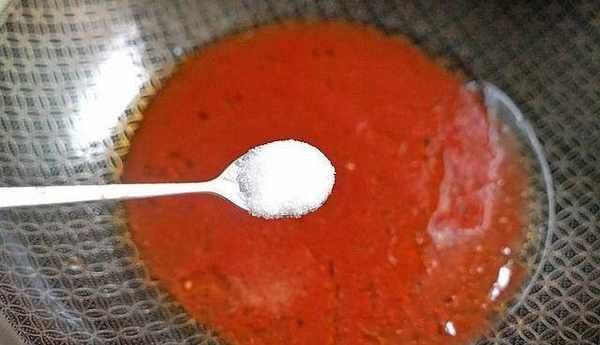 6。擦幹幹凈的鍋,倒入少許油,然後加入番茄醬、鹽、糖、一茶匙水慢慢煮開。如果你認為番茄醬不夠酸,可以加些白醋。
