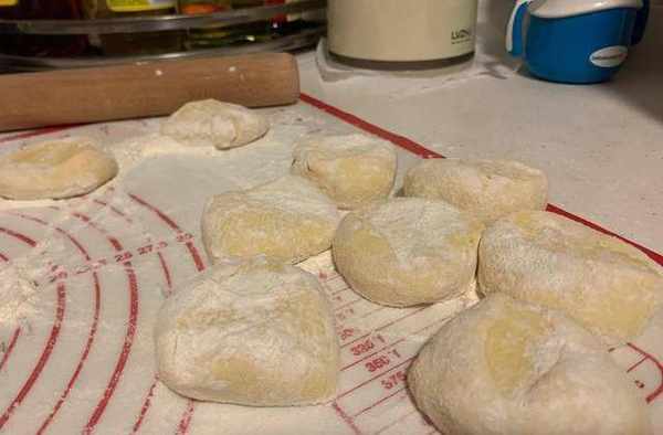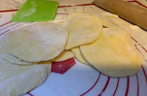 七:搟面墊上撒上幹面粉,把醒發好的面團重復揉挫給面團排氣,然後再揉成光滑的長條狀,用刀切成一個個小劑子,抓一把面粉撒在切好的小劑子上,這樣搟面胚的時候不會粘黏,取一個小子按扁後,用搟面杖搟成圓形面胚,不要搟得太薄,搟成兩邊薄中間厚的圓形就可以瞭。拿一個面胚放手掌托住,另一隻手用勺子把餡料放到面胚上按同一方向,用手捏成形收好口,這樣包子胚就做好瞭。