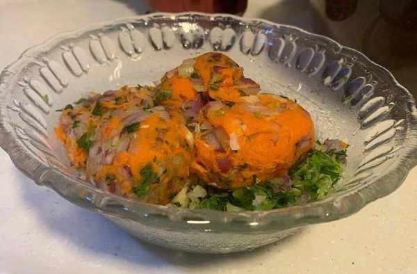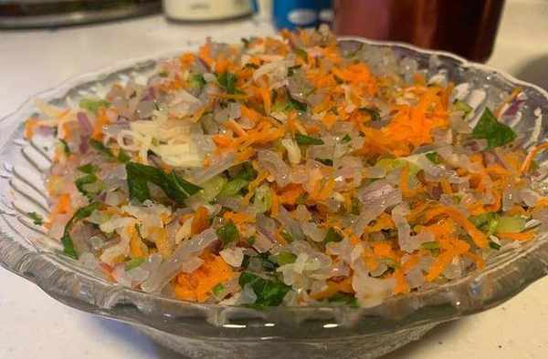 六:把切好的紅薯粉條和雜菜一起混合翻拌均勻,待面團醒發就可以準備包瞭,在餡裡放入五香粉,胡椒粉,生抽,鹽,油適量,不過你可以根據自己口味添加調料,沒有固定的要求,下圖是混合好的雜菜。