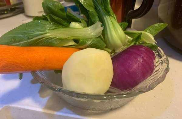 四:準備洗好的雜菜:上海青,胡蘿卜,土豆,洋蔥,分別切碎,胡蘿卜,土豆我是用刮絲器刮成絲,不用切碎,其它需要切碎,盡量切碎點,我傢裡這些囤得多,所以用這幾種蔬菜做雜菜包子。