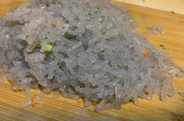 三:鍋中加水燒開,把紅薯粉條放進鍋中大火煮5分鐘關火,在開水裡浸泡10分鐘,放涼後撈起用清水沖洗一下,用刀切碎備用。