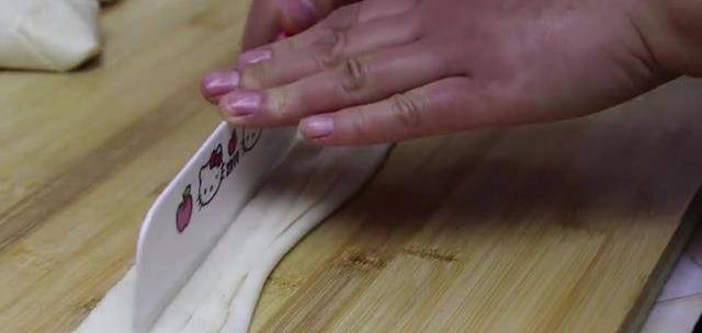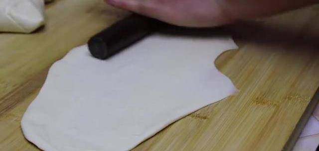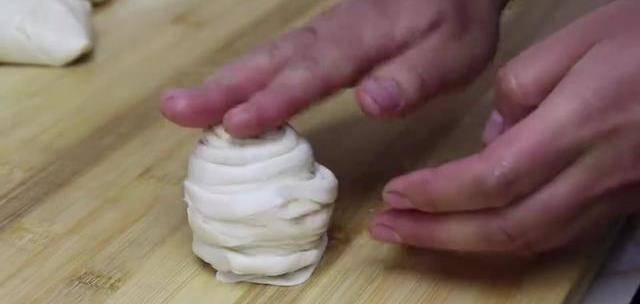 然後按扁再用搟面杖搟一下,搟成大一點的面片,再均勻地抹上,咱們提前做好的油酥,從底下往中間折一下,上面也往中間折一下,然後用手按扁,再用刀切一下。把切開的地方抖開,再從一頭卷起來,收口處壓在下面,再用手按扁就可以瞭,先放在一邊備用,把剩下的面劑全部做完。