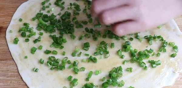 準備把小蔥把它切成蔥花。切之後裝瞭碗中備用。現在我們來調一點油酥,30克熱油給它爆香,再給它攪拌均勻。 攪拌成這個樣子,放在旁邊用。像這樣的面劑已經醒發好瞭取個面餅放在面板上,用手輕輕。新牌匾,再用搟面杖給它搟成薄一點的大圓餅。改成這個樣子就可以再放上剛調好的油酥,用刷子給他刷均勻,再撒入適量的蔥花,然後這裡給它切上一刀,再從一邊給它卷起來。給他捏緊實瞭,防止漏心。
