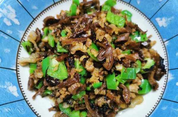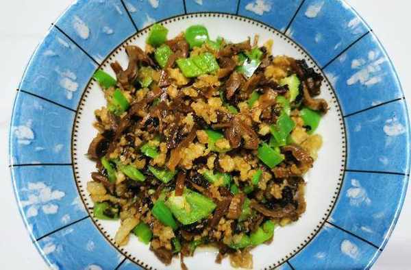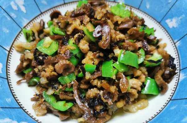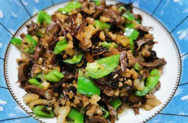 食材準備:豬肉末150克,外婆菜一棵,青椒一個,蒜末。
