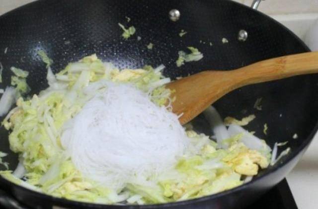 5.炒軟娃娃菜稍微加半碗涼白開,開中火燉三四分鐘,就把粉絲倒進鍋裡,一起翻炒翻炒。