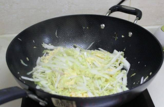 4.煎好雞蛋之後,把雞蛋盛進碗裡。鍋裡再放一點花生油,油熱後,首先炒炒蔥花,再把切好的娃娃菜,放進鍋裡炒軟。娃娃菜,最好放進熱水裡燙一下。燙三四分鐘,燙好後過涼水,把水控幹備用。那樣的話,在炒的時候比較容易炒熟。