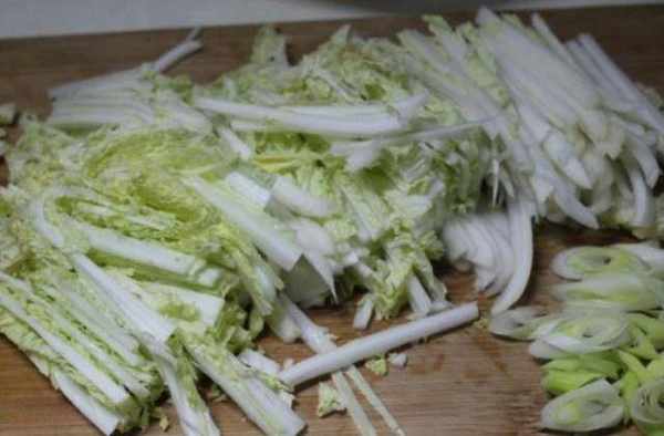 準備好這道菜,所用的主食材和配料。現在我們就開始做這道菜瞭。首先把挑選好的娃娃菜洗幹凈切成絲。挑選娃娃菜的時候要挑選看起來很新鮮,水分很多的那種娃娃菜。也不用挑個頭太大的娃娃菜。切好絲後,放在切菜板上準備一會用,這個時候也接著把蔥洗一下,用刀傾斜著,切成大蔥花狀。