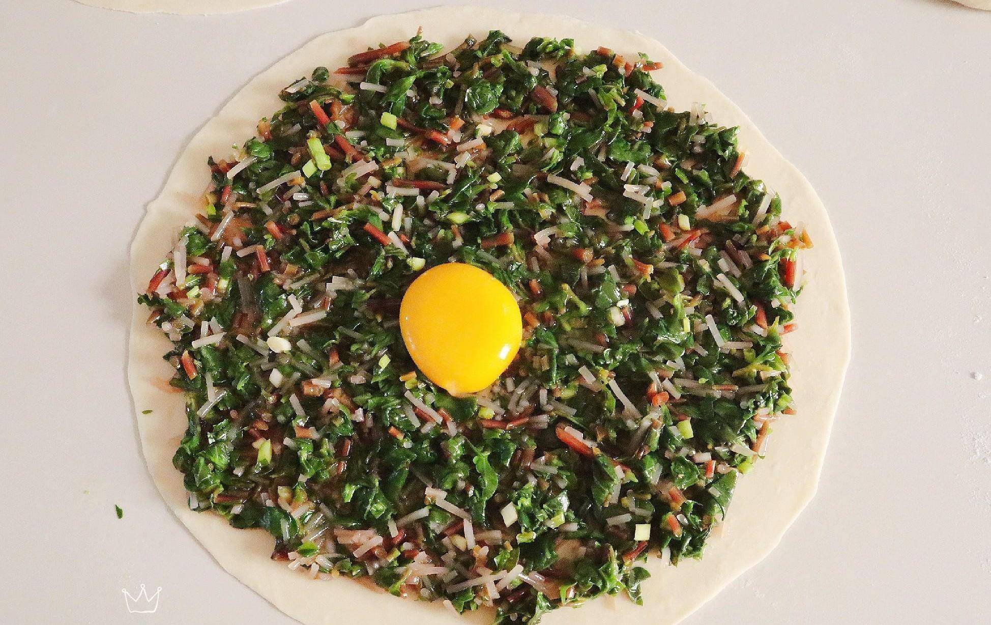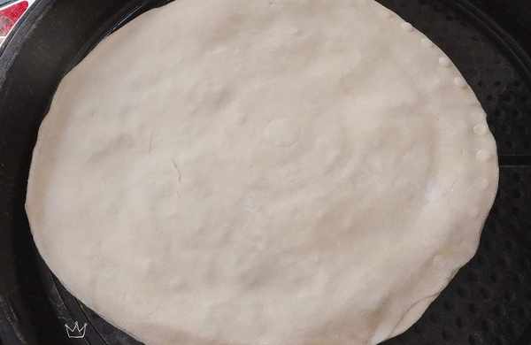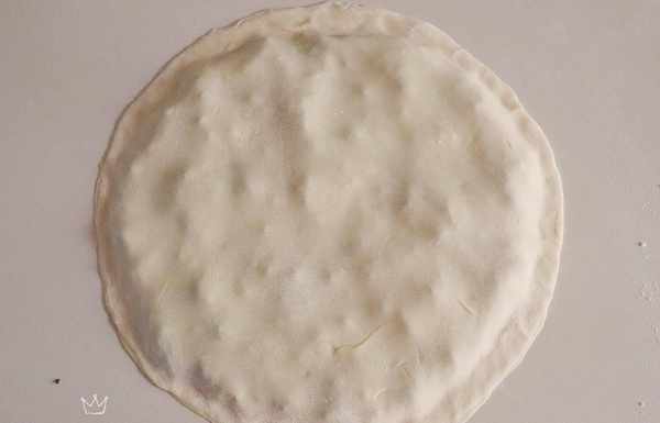 11、再拿一個面劑,搟成與上圖大小差不多的圓形面片,蓋在上圖的餡料上,周邊用手壓緊實,防止露餡。