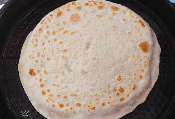 12、烙至菜餅上層開始鼓包、底部面皮微黃時翻面,蓋上蓋子繼續烙兩分鐘,烙至兩面面皮都微黃時,用鍋鏟按壓一下,菜餅回彈,說明已經烙熟瞭,這個時候就可以出鍋瞭。