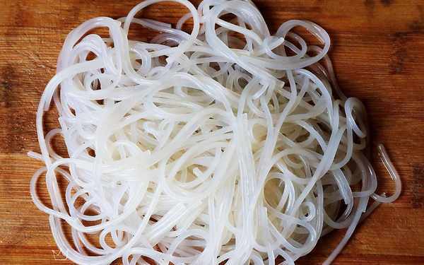 6、準備一把紅薯粉條,提前用溫水泡軟,切碎後一同放入大碗中。