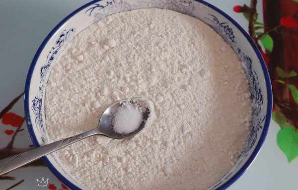 3、面盆中倒入300克的面粉,加入一點食鹽攪拌均勻,增加面的筋性。