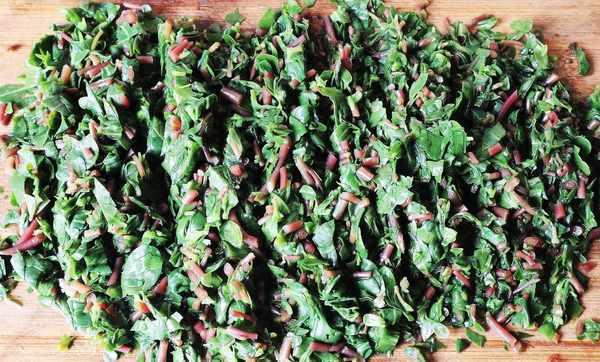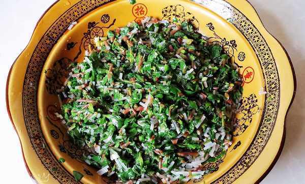 5、醒面的過程中開始準備餡料,先把焯燙好的馬齒莧切碎,再用手擠掉多餘的水分,放入一個大一點的碗中備用。