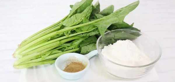 2、把菠菜切碎,加入鹽、五香粉,分次一點點的加面粉,攪拌成絮狀