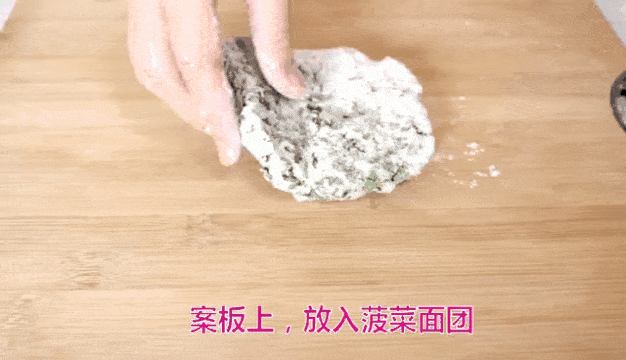 3、在案板上,放入菠菜面團,撒少量幹面粉,直接搟開成薄餅