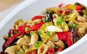 5、將大腸推至一邊,下酸菜翻炒,酸菜炒香後和大腸翻炒均勻,加胡椒粉調味,加紅椒翻炒至斷生即可。