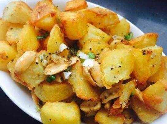 4、煎好土豆撒上適量鹽、雞精、 胡椒粉和少許辣椒面拌勻即可。